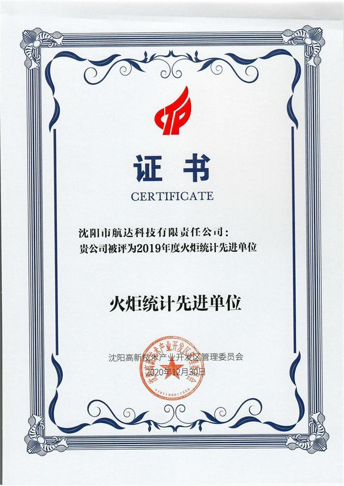 沈陽市航達科技有限責任公司被評為2019年度火炬統(tǒng)計先進單位