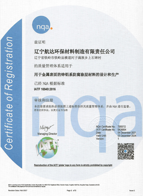 沈陽市航達科技有限責任公司通過IATF16949汽車質量管理體系認證